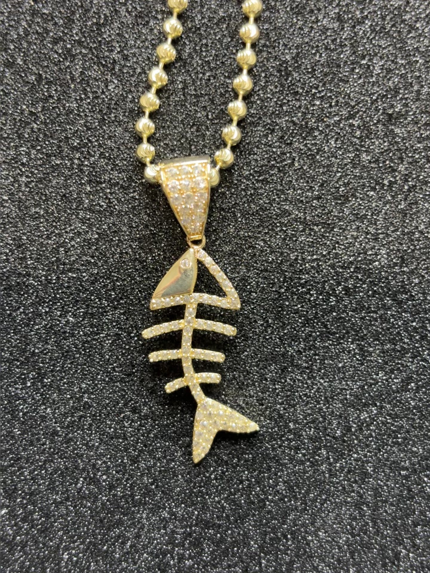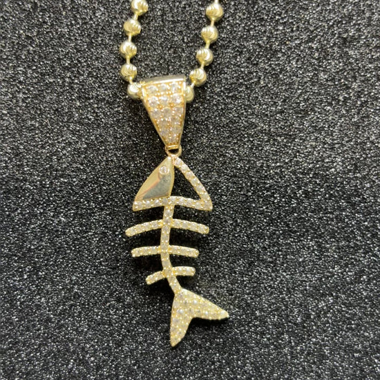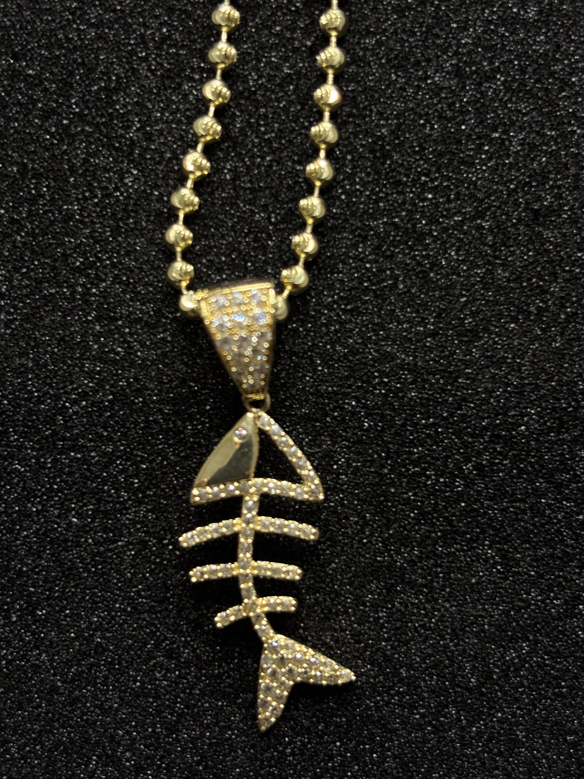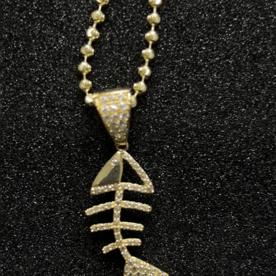 El colgante presenta el esqueleto de un pez con un diseño iced out (totalmente cubierto) de brillantes circonitas cúbicas en la cabeza, la cola y las aletas, mientras que las espinas y la reasa están decoradas con micropavé. La cadena de bolitas, conocida por su resistencia y estilo casual, es el complemento perfecto.
