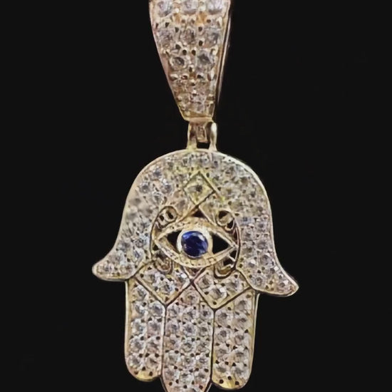 Forjado en oro sólido de 14K y engastado con destellos brillantes, este dije de Mano de Hamsa encarna un símbolo ancestral de protección, bendición y fortaleza espiritual. El ojo central, destacado con un tono profundo, representa la capacidad de ver más allá y alejar las energías negativas, guiando a quien lo porta hacia un camino de luz y bienestar.